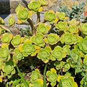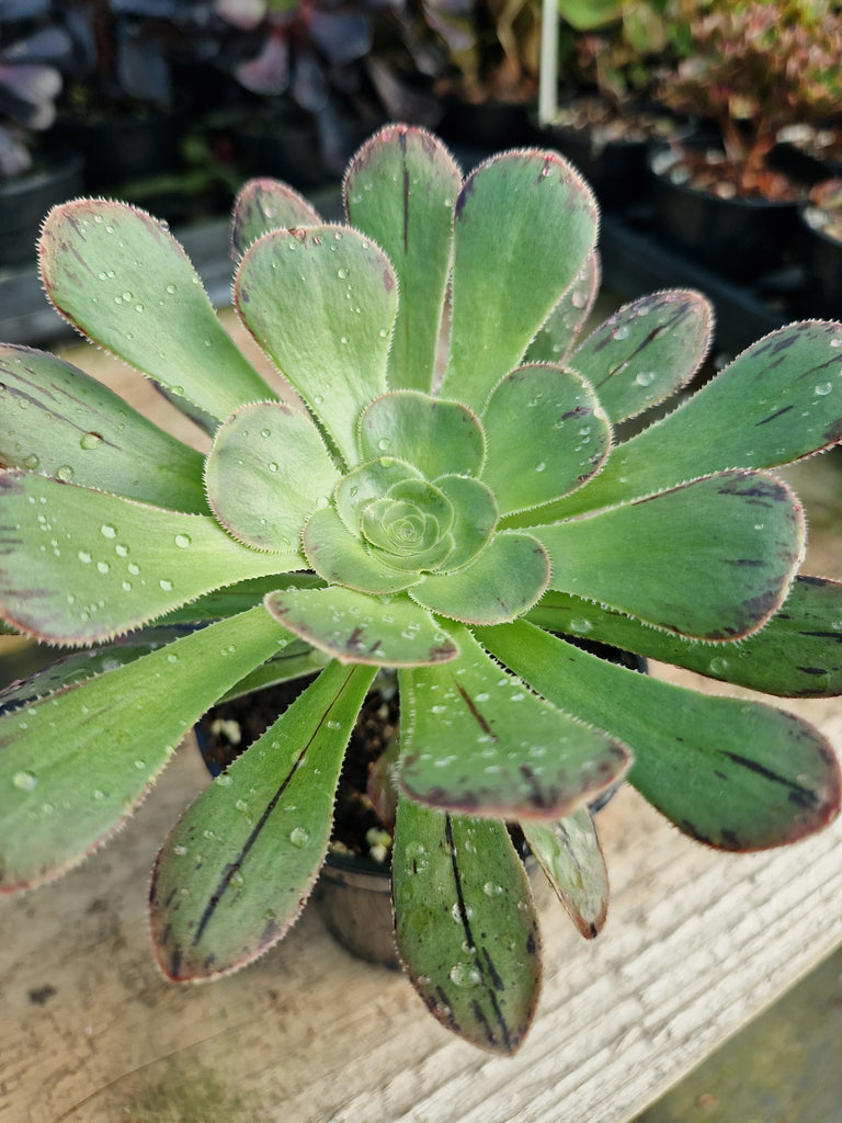 A tall branching Aeonium with quite big rosettes. The green leaves will contrast well when grown with other darker leaved Aeonium and will help to make a great statement plant when grown in a pot or garden. It will require a free draining soil/compost and a sunny aspect to bring out it's full potential. Keep frost free for best results.